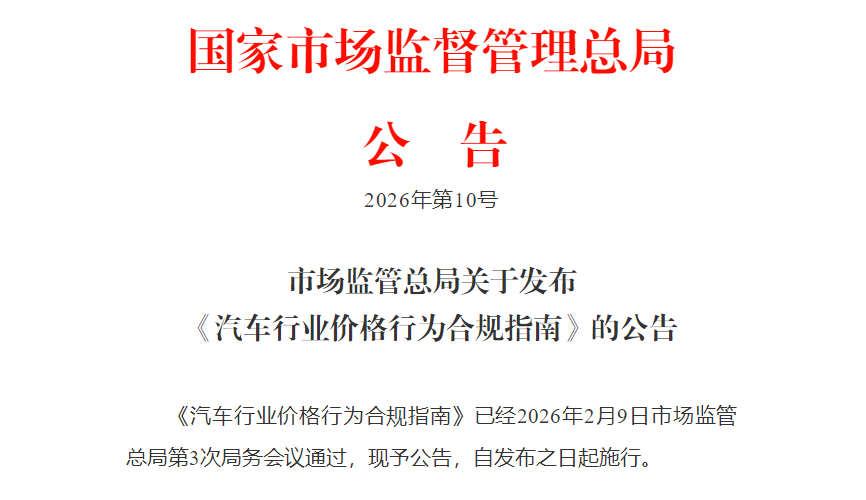 中国经济网北京2月12日讯(记者 陈梦宇) 今日,国家市场监督管理总局正式发布《汽车行业价格行为合规指南》(以下 简称《指南》),旨在进一步规范汽车行业价格行为,明晰市场竞争行为边界,整治行业"内卷式"无序竞争,推动汽车市 场形成优质优价、公平有序的发展环境。 《指南》明确,汽车生产企业除依法降价处理积压商品外,不得以排挤竞争对手为目的,将产品以低于成本的价格进行销 售;严禁通过价格串通、哄抬价格、变相降价等方式扰乱市场秩序。 针对销售环节,《指南》重点规制欺骗性、误导性标价行为,要求销售企业以显著方式明码标价,不得使用虚假或引人误 解的语言、文字、数字、图片、视频等诱骗消费者交易。 同时,《指南》还对促销活动、配件定价、售后服务收费等关键场景提出了具体合规要求。 市场监管总局表示,汽车产业是国民经济的重要支柱,产业链长、覆盖面广,与消费者生活密切相关。当前,汽车行业存 在不按规定明码标价、价格欺诈等违法行为,损害消费者和经营者利益,破坏公平竞争市场秩序,不利于行业高质量发 展。《指南》立足当前汽车行业发展实际,进一步明晰行为边界,统一监管规则,引导汽车生产和销售企业依法合规经 营,推动形成优质优价、良性竞争 ...