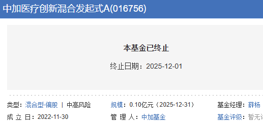 中加医疗创新混合发起式清盘 成立3年亏损2成