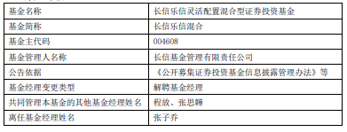 | 基金名称 | 长信乐信灵活配置混合型证券投资基金 | | --- | --- | | 基金简称 | 长信乐信混合 | | 基金主代码 | 004608 | | 基金管理人名称 | 长信基金管理有限责任公司 | | 公告依据 | 《公开募集证券投资基金信息披露管理办法》等 | | 基金经理变更类型 | 解聘基金经理 | | 共同管理本基金的其他基金经理姓名 | 程放、张思辩 | | 离任基金经理姓名 | 张子乔 | (责任编辑:康博) 中国经济网北京2月11日讯 今日,长信基金公告,张子乔离任长信乐信混合。 张子乔曾任职于东证融汇证券资产管理有限公司,2016年加入长信基金管理有限责任公司,任职于 研究发展部,担任研究员兼基金经理助理,2020年8月18日起担任基金经理。 长信乐信灵活配置混合A/C成立于2017年12月07日,截至2026年02月10日,其今年来收益率为 1.93%、1.90%,成立来收益率为42.94%、41.97%,累计净值为1.3912元、1.3832元。 ...