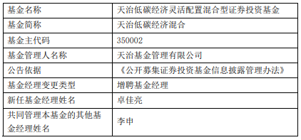 | 基金名称 | 天治低碳经济灵活配置混合型证券投资基金 | | --- | --- | | 基金简称 | 天治低碳经济混合 | | 基金主代码 | 350002 | | 基金管理人名称 | 天治基金管理有限公司 | | 公告依据 | 《公开募集证券投资基金信息披露管理办法》 | | 基金经理变更类型 | 增聘基金经理 | | 新任基金经理姓名 | 卓佳亮 | | 共同管理本基金的其他基 | 李申 | | 金经理姓名 | | (责任编辑:康博) 中国经济网北京1月19日讯 近日,天治基金公告,天治低碳经济混合增聘卓佳亮。 卓佳亮曾任兴证证券资产管理有限公司(原兴业证券资产管理部)研究员、投资经理;嘉实基金管 理有限公司投资经理。2025年8月加入天治基金管理有限公司,历任产品开发与金融工程部副总监,现 任权益投资部副总监、基金经理。 天治低碳经济混合成立于2005年01月12日,截至2026年01月16日,其今年来收益率为-3.04%,成立 来收益率为277.30%,累计净值为3.5631元。 ...