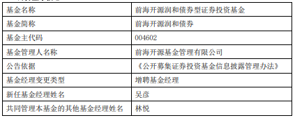 中国经济网北京1月19日讯 近日,前海开源基金公告,前海开源润和债券增聘吴彦。 前海开源润和债券A/C(004602/004603)成立于2017年08月14日,截至2026年01月16日,其今年来收 益率为0.16%、0.15%,成立来收益率为38.23%、36.09%,累计净值为1.3657元、1.3472元。 | 基金名称 | 前海开源润和债券型证券投资基金 | | --- | --- | | 基金简称 | 前海开源润和债券 | | 基金主代码 | 004602 | | 基金管理人名称 | 前海开源基金管理有限公司 | | 公告依据 | 《公开募集证券投资基金信息披露管理办法》 | | 基金经理变更类型 | 增聘基金经理 | | 新任基金经理姓名 | 局婆 | | 共同管理本基金的其他基金经理姓名 | 林悦 | (责任编辑:康博) 吴彦2012年至2014年任财达证券固定收益部债券研究员;2014年4月加盟前海开源基金管理有限公 司,现任公司基金经理。 ...