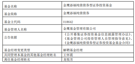 中国经济网北京1月19日讯 近日,金鹰基金公告,龙悦芳离任金鹰添福纯债债券,王怀震管理。 王怀震曾任新疆证券有限责任公司研究所行业研究员,浙商银行股份有限公司债券交易员,招商证 券股份有限公司投资经理,银华基金管理股份有限公司基金经理,歌斐诺宝资产管理公司总经理助理, 嘉实基金管理有限公司投资经理,招商信诺资产管理有限公司副总经理等职务。2022年7月加入金鹰管 理有限公司,现任总经理助理、混合投资部总经理、基金经理。 金鹰添福纯债债券A/C成立于2023年09月25日,截至2026年01月16日,其今年来收益率为0.06%、 0.06%,成立来收益率为6.98%、6.49%,累计净值为1.0688元、1.0641元。 | 基金名称 | 金鹰漆福纯债债券型证券投资基金 | | --- | --- | | 基金简称 | 金鹰漆福纯债债券 | | 基金主代码 | 018642 | | 基金管理人名称 | 金鹰基金管理有限公司 | | 公告依据 | 《公开募集证券投资基金信息披露管理办法》、 | | | 《基金管理公司投资管理人员管理指导意见》、 《金鹰漆福纯债券型证券投资基金基金合同》 | | 基金经理变更类型 ...