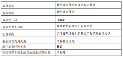 新华鼎利债券A/C成立于2019年06月12日,新华鼎利债券E成立于2021年11月17日,截至2026年01 月16日,其今年来收益率为0.13%、0.12%、0.12%,成立来收益率为26.04%、22.55%、13.58%,累计净 值为1.2579元、1.2236元、1.1352元。 (责任编辑:康博) 中国经济网北京1月19日讯 近日,新华基金公告,新华鼎利债券增聘林翟。 林翟曾任华农财产保险股份有限公司投资经理、中英人寿保险有限公司投资经理、新时代证券股份 有限公司高级投资经理、北信瑞丰基金管理有限公司基金经理。 | 基金名称 | 新华鼎利债券型证券投资基金 | | --- | --- | | 基金简称 | 新华鼎利债券 | | 基金主代码 | 004647 | | 基金管理人名称 | 新华基金管理股份有限公司 | | 公告依据 | 公开募集证券投资基金信息披露管理办法 | | 基金经理变更类型 | 增聘基金经理 | | 新任基金经理姓名 | 林程 | | 共同管理本基金的其他基金经理姓名 | 李晓然 | ...