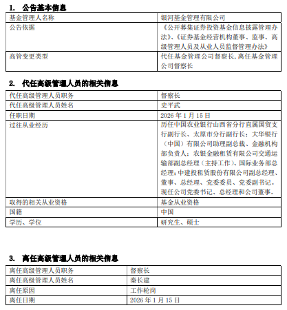 中国经济网北京1月19日讯 近日,银河基金公告,史平武代任督察长,秦长建离任。 史平武历任中国农业银行山西省分行直属国贸支行副行长、太原市分行副行长;大华银行(中国) 有限公司助理副总裁、金融机构部负责人;农银金融租赁有限公司交通运输部副总经理(主持工作)、 国际业务部总经理;中建投租赁股份有限公司副总经理、董事、总经理、党委委员、党委副书记。现任 公司党委书记、总经理和公司董事。 | 基金管理人名称 | 银河基金管理有限公司 | | --- | --- | | 公告依据 | 《公开募集证券投资基金信息披露管理办 | | | 法》、《证券基金经营机构董事、监事、高 | | | 级管理人员及从业人员监督管理办法》 | | 高管变更类型 | 代任基金管理公司督察长,离任基金管理 | | | 公司督察长 | | 代任高级管理人员职务 | 督察长 | | --- | --- | | 代任高级管理人员姓名 | 史平武 | | 任职日期 | 2026年1月15日 | | 过往从业经历 | 历任中国农业银行山西省分行直属国贸支 | | | 行副行长、太原市分行副行长:大华银行 | | | (中国)有限公司助理副总裁、金融机 ...