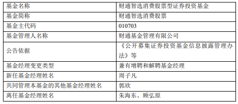 财通数字经济智选混合发起A/C成立于2024年06月04日,截至2026年01月16日,其今年来收益率为 9.00%、8.98%,成立来收益率为69.18%、67.79%,累计净值为1.6918元、1.6779元。 | 基金名称 | 财通智选消费股票型证券投资基金 | | --- | --- | | 基金简称 | 财通智选消费股票 | | 基金主代码 | 010703 | | 基金管理人名称 | 财通基金管理有限公司 | | 公告依据 | 《公开募集证券投资基金信息披露管理办 法》等 | | 基金经理变更类型 | 兼有增聘和解聘基金经理 | | 新任基金经理姓名 | 周子凡 | | 共同管理本基金的其他基金经理姓名 | 郭欣 | | 离任基金经理姓名 | 朱海东、顾弘原 | 中国经济网北京1月19日讯 近日,财通基金公告,财通智选消费股票、财通数字经济智选混合发起 增聘周子凡。 周子凡历任国海证券股份有限公司研究所研究员。2023年8月加入财通基金管理有限公司,曾任量 化投资部量化研究员,现任量化投资部基金经理。 财通智选消费股票A/C成立于2021年01月27日,截至2026年01月16日,其今年来收益率为 ...