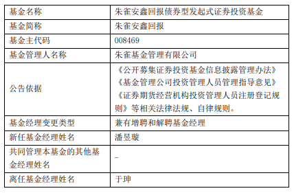 朱雀安鑫回报增聘潘昱璇 于珅离任