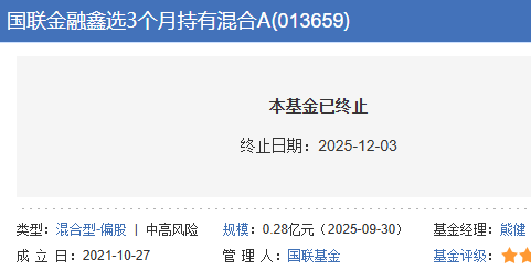 国联金融鑫选3个月持有期混合清盘 成立4年多涨1成