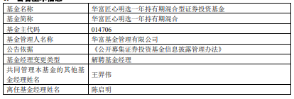 | 基金名称 | 华富匠心明选一年持有期混合型证券投资基金 | | --- | --- | | 基金简称 | 华富匠心明选一年持有期混合 | | 基金主代码 | 014706 | | 基金管理人名称 | 华富基金管理有限公司 | | 公告依据 | 《公开募集证券投资基金信息披露管理办法》 | | 基金经理变更类型 | 解聘基金经理 | | 共同管理本基金的其他基 | 王男伟 | | 金经理姓名 | | | 离任基金经理姓名 | 陈启明 | 华富匠心明选一年持有混合A/C成立于2022年03月25日,截至2026年01月16日,其今年来收益率为 0.59%、0.58%,成立来收益率为-9.61%、-10.98%,累计净值为0.9039元、0.8902元。 中国经济网北京1月19日讯 近日,华富基金公告,陈启明离任华富匠心明选一年持有期混合。 陈启明历任日盛嘉富证券上海代表处研究员、群益证券上海代表处研究员、中银国际证券产品经 理。2010年2月加入华富基金管理有限公司,曾任行业研究员、研究发展部副总监。现任公司总经理助 理、权益投资部总监、公司公募投资决策委员会联席主席。 (责任编辑:康博) ...