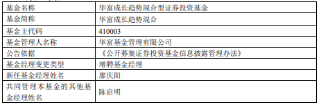 华富成长趋势混合A/C成立于2007年03月19日和2023年12月25日,截至2026年01月16日,其今年来 收益率为13.87%、13.85%,成立来收益率为190.27%、40.20%,累计净值为2.4978元、2.0574元。 中国经济网北京1月19日讯 近日,华富基金公告,华富成长趋势混合增聘廖庆阳。 廖庆阳历任中泰证券股份有限公司投资顾问、海通证券股份有限公司分析师、天风证券股份有限公 司高级分析师、凯盛融英(科技)股份有限公司医药行业负责人。2020年9月加入华富基金管理有限公 司,曾任研究发展部基金经理助理、研究发展部总监助理,自2021年11月10日起任基金经理。 | 基金名称 | 华富成长趋势混合型证券投资基金 | | --- | --- | | 基金简称 | 华富成长趋势混合 | | 基金主代码 | 410003 | | 基金管理人名称 | 华富基金管理有限公司 | | 公告依据 | 《公开募集证券投资基金信息披露管理办法》 | | 基金经理变更类型 | 增聘基金经理 | | 新任基金经理姓名 | 廖庆阳 | | 共同管理本基金的其他基 | 陈启明 | | 金经理姓名 | | (责任编 ...