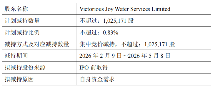 中国经济网北京1月19日讯 金科环境(688466.SH)昨晚披露持股5%以上股东减持股份计划公告称截 至公告披露日,Victorious Joy Water Services Limited(以下简称"利欣水务")持有金科环境股份 8,675,171股,占公司总股本的7.05%。 | 股东名称 | Victorious Joy Water Services Limited | | --- | --- | | 计划减持数量 | 不超过:1,025,171 股 | | 计划减持比例 | 不超过:0.83% | | 减持方式及对应减持数量 | 集中竞价减持,不超过:1,025,171 股 | | 减持期间 | 2026年2月9日~2026年5月8日 | | 拟减持股份来源 | IPO 前取得 | | 拟减持原因 | 自身资金需求 | 金科环境2023年7月11日公布分红方案显示,每10股送2股,股权登记日为2023年7月14日,红股上 市日与除权除息日为2023年7月17日。 金科环境于2020年5月8日在上交所科创板上市,发行价格为24.61元/股。上市首日,金科环境开盘 报46.00元,涨幅86.92%,盘中 ...