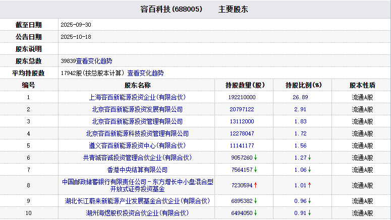 截至2025年9月30日,中国邮政储蓄银行有限责任公司-东方增长中小盘混合型开放式证券投资基金为第8大 股东,持股比例为1.01%。 | | 容百科技(688005) | 主要股东 | | | | --- | --- | --- | --- | --- | | 截至日期 | 2025-09-30 | | | | | 公告日期 | 2025-10-18 | | | | | 股东说明 | | | | | | 股东总数 | 39839查看变 超势 | | | | | 平均持股数 | 17942股(按总股本计算)查看受化趋势 | | | | | 행음 | 股东名称 | 持股数重(股) | 持股比例(8) | 股本性质 | | 1 | 上海容百新能源投资企业(有限合伙) | 192210000 | 26.89 | 流通A股 | | 2 | 北京容百新能源投资发展有限公司 | 20797122 | 2.91 | 流通A股 | | 3 | 北京容百新能源投资管理有限公司 | 13112000 | 1.83 | 流通A股 | | 4 | 北京容百新能源科技投资管理有限公司 | 12278047 | 1.72 | 流通A股 | ...