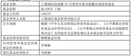 中国经济网北京2月9日讯近日,工银瑞信基金公告,刘伟琳离任工银瑞信创业板50ETF。 刘伟琳2010年加入工银瑞信,曾任金融工程分析师、投资经理助理、投资经理;2010年7月1日加入工银 瑞信基金管理有限公司,现担任指数及量化投资部投资副总监、基金经理。 工银瑞信创业板50ETF成立于2025年01月10日,截至2026年02月06日,其今年来收益率为-0.15%,成立 来收益率为67.26%,累计净值为1.6733元。 | 基金名称 | 工银瑞信创业板 50 交易型开放式指数证券投资基金 | | --- | --- | | 基金简称 | 创 50ETF 工铝 | | 基金主代码 | 159370 | | 基金管理人名称 | 工银瑞信基金管理有限公司 | | 公告依据 | 根据《中华人民共和国证券投资基金法》、《公开募集证券投 | | | 资基金运作管理办法》、《公开募集证券投资基金信息披露管 | | | 理办法》及其他有关法律法规以及本基金相关法律文件等。 | | 基金经理变更类型 | 解聘基金经理 | | 共同管理本基金的其他 | 李锐敏 | | 基金经理姓名 | | | 离任基金经理姓名 | 刘伟琳 | ...