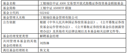 中国经济网北京2月9日讯近日,工银瑞信基金公告,焦文龙离任工银中证A500ETF联接。 焦文龙曾任鹏华基金执行总经理,基金经理;2021年加入工银瑞信,现任指数及量化投资部总经理、基 金经理。 工银中证A500ETF联接A/C成立于2024年11月26日,截至2026年02月06日,其今年来收益率为2.35%、 2.32%,成立来收益率为26.71%、26.33%,累计净值为1.2671元、1.2633元。工银中证A500ETF联接Y成 立于2024年12月13日,截至2026年02月06日,其今年来收益率为2.35%,成立来收益率为27.08%,累计 净值为1.2671元。 | 基金名称 | 工银瑞信中证 A500交易型开放式指数证券投资基金联接基金 | | --- | --- | | 基金简称 | 工银中证 A500ETF 联接 | | 基金主代码 | 022442 | | 基金管理人名称 | 工银瑞信基金管理有限公司 | | 公告依据 | 根据《中华人民共和国证券投资基金法》、《公开募集证券投 | | | 资基金运作管理办法》、《公开募集证券投资基金信息披露管 | | | 理办法》及其他有关法律法规以及 ...