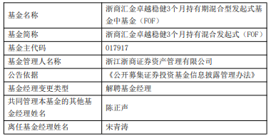 中国经济网北京2月9日讯 近日,浙江浙商证券资管公告,宋青涛离任浙商汇金卓越稳健3个月持有 混合发起式FOF、浙商汇金卓越配置一年持有混合FOF。 | 基金名称 | 浙商汇金卓越稳健3个月持有期混合型发起式基 | | --- | --- | | | 金中基金(FOF) | | 基金简称 | 浙商汇金卓越稳健3个月持有混合发起式(FOF) | | 基金主代码 | 017917 | | 基金管理人名称 | 浙江浙商证券资产管理有限公司 | | 公告依据 | 《公开募集证券投资基金信息披露管理办法》 | | 基金经理变更类型 | 解聘基金经理 | | 共同管理本基金的其他基 | 陈正声 | | 金经理姓名 | | | 离任基金经理姓名 | 宋青涛 | | 基金名称 | 浙商汇金卓越配置一年持有期混合型基金中基 | | --- | --- | | | 金(FOF) | | 基金简称 | 浙商汇金卓越配置一年持有混合(FOF) | | 基金主代码 | 013781 | | 基金管理人名称 | 浙江浙商证券资产管理有限公司 | | 公告依据 | 《公开募集证券投资基金信息披露管理办法》 | | 基金经理变更类型 | 解聘 ...