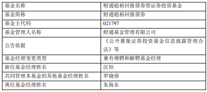 财通先进制造智选混合发起A/C成立于2024年05月29日,截至2026年02月06日,其今年来收益率为 2.45%、2.40%,成立来收益率为50.40%、49.13%,累计净值为1.5040元、1.4913元。 中国经济网北京2月9日讯近日,财通基金公告,朱海东离任财通稳裕回报债券、财通先进制造智选混合 发起。 朱海东历任银河基金管理有限公司量化研究员,平安资产管理有限责任公司研究经理。2019年6月加入 财通基金管理有限公司,曾任量化投资部基金经理,现任量化投资部副总经理(主持工作)、基金经理。 财通稳裕回报债券A/C成立于2024年12月10日,截至2026年02月06日,其今年来收益率为0.32%、 0.29%,成立来收益率为2.43%、2.05%,累计净值为1.0243元、1.0205元。 | 基金名称 | 财通稳裕回报债券型证券投资基金 | | --- | --- | | 基金简称 | 财通稳裕回报债券 | | 基金主代码 | 021797 | | 基金管理人名称 | 财通基金管理有限公司 | | 公告依据 | 《公开募集证券投资基金信息披露管理办 法》等 | | 基金经理变更类型 | 兼有增聘 ...