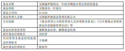 | 基金名称 | 交银施罗德鸿光一年持有期混合型证券投资基金 | | --- | --- | | 基金间称 | 交银鸿光一年混合 | | 基金主代码 | 011256 | | 基金管理人名称 | 交银施罗德基金管理有限公司 | | 公告依据 | 《基金管理公司投资管理人员管理指导意见》、《公开募集证券投资 基金信息披露管理办法》等 | | 基金经理变更类型 | 增聘基金经理、解聘基金经理 | | 新任基金经理姓名 | 刘庆祥 | | 共同管理本基金的其他基 | 于海颜 | | 金经理姓名 | | | 离任基金经理姓名 | 陈俊华 | (责任编辑:康博) 中国经济网北京2月9日讯 近日,交银施罗德基金公告,交银鸿光一年混合增聘刘庆祥,陈俊华离 任。 刘庆祥2016年加入交银施罗德基金管理有限公司,历任行业分析师、混合资产投资部基金经理助 理。 交银鸿光一年混合A/C成立于2021年03月08日,截至2026年02月06日,其今年来收益率为0.77%、 0.74%,成立来收益率为7.99%、5.89%,累计净值为1.0799元、1.0589元。 ...