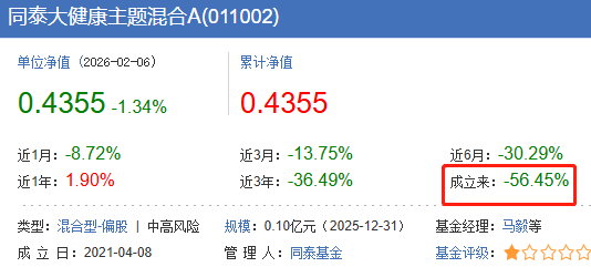 同泰大健康主题混合基金共经历4位基金经理的陆续管理,其现任基金经理为马毅和麦健沛,但可惜的 是,至今还没有一位在管理任期内实现正回报。 基金经理变动一览 中国经济网北京2月9日讯 2月4日,智通财经发布《2021年成立的基金还拿不回本?五成亏损 问题究竟 出在哪?》一文。文中称,2021年大量主动权益基金密集成立,但2021年那一批在牛市尾声发车的基金却 并没有集体扬眉吐气。智通财经记者以2021年成立并仍存续的667只主动权益基金为样本统计发现,截至最 新净值,仍有约362只成立以来收益为负,占比超过五成。其中86只基金自成立以来跌幅在30%以上,34只 的回撤更是超过40%。 根据天天基金网最新数据显示,成立于2021年4月8日的同泰大健康主题混合基金A/C,在截至2026年2 月6日的最新累计收益率为-56.45%和-57.28%,累计单位净值仅有0.4355元、0.4272元。 | 同泰大健康主题混合A(011002) | | | | --- | --- | --- | | 单位净值(2026-02-06) | 累计净值 | | | 0.4355 -1.34% | 0.4355 | | | 沂1月: ...