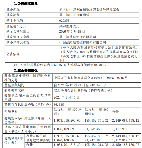 中国经济网北京1月16日讯今日,易方达基金发布易方达中证800指数增强型证券投资基金基金合同生效 公告。 | 基金募集申请获中国证监会核 | | 中国证券监督管理委员会证监许可〔2025〕2746号 | | | | --- | --- | --- | --- | --- | | 准的文号 | | | | | | 基金募集期间 | | 自 2025年 12月 24日至 2026年1月13日 | | | | 验资机构名称 | | 安永华明会计师事务所(特殊普通合伙) | | | | 募集资金划入基金托管专户的 日期 | | 2026年1月15日 | | | | 募集有效认购总户数(单位 户) | | 56. 735 | | | | 份額类别 | | 易方达中证 800 增 | 易方达中证 800 | 合计 | | | | 弾 A | 增强 C | | | 募集期间净认购金额(单位:人 | | 1. 953. 615. 206. 60 | 195. 452. 351. 52 | 2.149.067.558.12 | | 民币元) | | | | | | 认购资金在募集期间产生的利 息(单位:人民币元) | | 1. ...