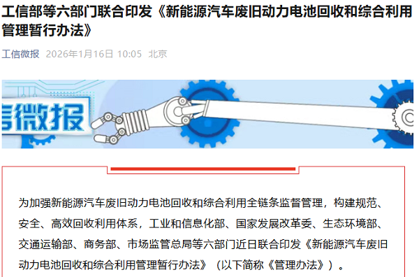 中国经济网1月16日讯(记者 姜智文)今日,工业和信息化部等六部门联合发布《新能源汽车废旧动 力电池回收和综合利用管理暂行办法》(以下简称"管理办法"),提出遵循"全渠道、全链条、全生命周 期"的管理思路,涵盖重点设计"车电一体报废"、建立新能源汽车动力电池数字身份证管理制度等。新 规自2026年4月1日起施行。 作为落实《健全新能源汽车动力电池回收利用体系行动方案》的重要举措,《管理办法》明确提出 坚持遵循"全渠道、全链条、全生命周期"管理的基本思路。 具体来看,全渠道抓好电池生产、车辆报废、换电运营、维修更换等各类废旧动力电池产生源头的 规范管理,重点设计"车电一体报废"等制度,防止出现废旧动力电池流向难以掌握的情况。全链条明确 电池生产、销售、维修、更换、拆解、回收、综合利用各环节各类主体责任义务。 全生命周期加强信息溯源管理,搭建全国新能源汽车动力电池溯源信息平台,建立新能源汽车动力 电池数字身份证管理制度,明确动力电池编码、信息报送等要求,运用数字化技术加强动力电池流向监 测。 近年来,我国新能源汽车产业快速发展,2025年新能源汽车产销量分别为1662.6万辆和1649万辆, 同比分别增长29%和 ...