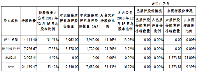 本次减持计划的实施不会导致公司控制权发生变更,不会对公司治理结构及持续性经营产生重大影响, 公司基本面也未发生重大变化。 截至2025年12月15日,宏川智慧A股总股本45,748.99万股。宏川集团质押股份数量5,962.00万股,占公 司总股本比例13.03%;宏川供应链质押股份数量1,720.00万股,占公司总股本比例3.76%。两大股东合 计质押股份数量占公司总股本比例16.79%。 根据公告,股东东莞市宏川化工供应链有限公司(以下简称"宏川供应链")计划自公告披露之日起15个交 易日后的三个月内(即2026年2月7日至2026年5月6日)以大宗交易方式减持公司股份不超过914.9797万股 (约占公司2026年1月9日总股本比例为2%)。 按上一交易日公司收盘价10.75元计算,宏川供应链拟减持套现合计约9,836.03万元。 截至公告披露日,宏川供应链持有公司股份7,926.67万股,约占公司2026年1月9日总股本比例为 17.33%。 宏川供应链为公司控股股东广东宏川集团有限公司(以下简称"宏川集团")及实际控制人林海川一致行动 人。截至公告披露日,实际控制人林海川直接和间接控制公司股份24, ...