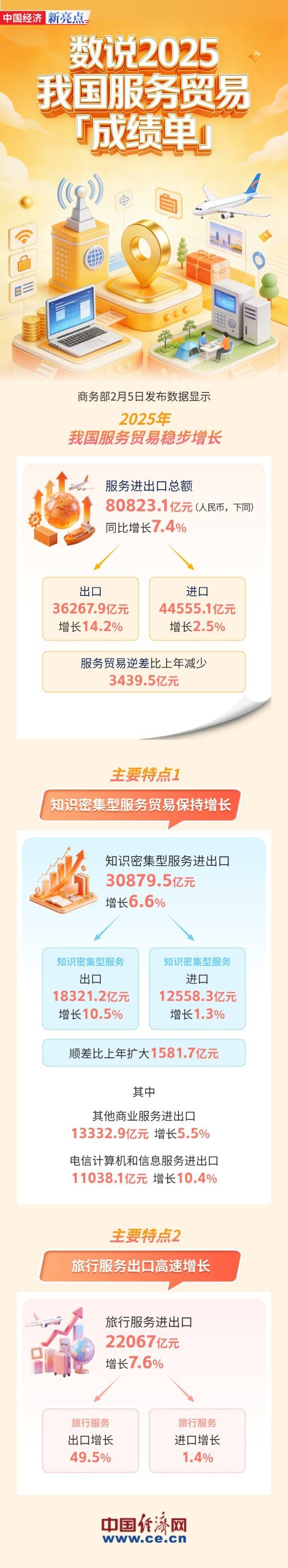 Group 1 - The core viewpoint of the article highlights the steady growth of China's service trade, with a total import and export value projected to reach 80,823 billion yuan by 2025, reflecting a year-on-year growth of 7.4% [1][2] Group 2 - The import value of services reached 36,267.9 billion yuan, while the export value was 44,555.1 billion yuan, indicating a growth of 14.2% for imports and 2.5% for exports [2] - The service trade deficit decreased by 3,439.5 billion yuan compared to the previous year, with a surplus expanding by 1,581.7 billion yuan [2][3] Group 3 - Knowledge-intensive service trade maintained growth, with a total import and export value of 30,879.5 billion yuan, marking a 6.6% increase [2] - The import of knowledge-intensive services was 18,321.2 billion yuan, showing a growth of 10.5%, while exports grew by 1.3% [2] Group 4 - Travel service exports experienced rapid growth, with a total import and export value of 22,067 billion yuan, reflecting a growth of 7.6% [3] - Travel service exports surged by 49.5%, while imports saw a modest increase of 1.4% [3]