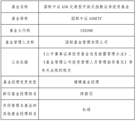 | 基金名称 | 国联中证 A50 交易型开放式指数证券投资基金 | | --- | --- | | 基金简称 | 国联中证 A50ETF | | 基金主代码 | 159390 | | 基金管理人名称 | 国联基金管理有限公司 | | 公告依据 | 《公开募集证券投资基金信息披露管理办法》 | | | 《基金管理公司投资管理人员管理指导意见》 等 | | | 有关法规的规定 | | 基金经理变更类型 | 增聘基金经理 | | 新任基金经理姓名 | 陈薪羽 | | 共同管理本基金的 | 杜超 | | 其他基金经理姓名 | | | 基金名称 | 国联中证 A50 交易型开放式指数证券投资基金 | | --- | --- | | | 联接基金 | | 基金向称 | 国联中证 A50 联接 | | 基金主代码 | 024004 | | 基金管理人名称 | 国联基金管理有限公司 | | 公告依据 | 《公开募集证券投资基金信息披露管理办法》 | | | 《基金管理公司投资管理人员管理指导意见》等 | | | 有关法规的规定 | | 基金经理变更类型 | 增聘基金经理 | | 新任基金经理姓名 | 陈薪羽 | | 共同管 ...