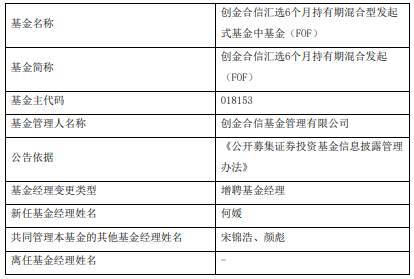 | 基金名称 | 创金合信汇选6个月持有期混合型发起 | | --- | --- | | | 式基金中基金(FOF) | | 基金简称 | 创金合信汇选6个月持有期混合发起 (FOF ) | | 基金主代码 | 018153 | | 基金管理人名称 | 创金合信基金管理有限公司 | | 公告依据 | 《公开募集证券投资基金信息披露管理 办法》 | | 基金经理变更类型 | 增聘基金经理 | | 新任基金经理姓名 | 何媛 | | 共同管理本基金的其他基金经理姓名 | 宋锦浩、颜彪 | | 离任基金经理姓名 | | | 基金名称 | 创金合信宜久来福3个月持有期混合型 | | --- | --- | | | 发起式基金中基金(FOF) | | 基金简称 | 创金合信宜久来福3个月持有期混合发 起(FOF) | | 基金主代码 | 013337 | | 基金管理人名称 | 创金合信基金管理有限公司 | | 公告依据 | 《公开募集证券投资基金信息披露管理 办法》 | | 基金经理变更类型 | 增聘基金经理 | | 新任基金经理姓名 | 何媛 | | 共同管理本基金的其他基金经理姓名 | 宋锦浩、颜彪 | | 离任 ...
