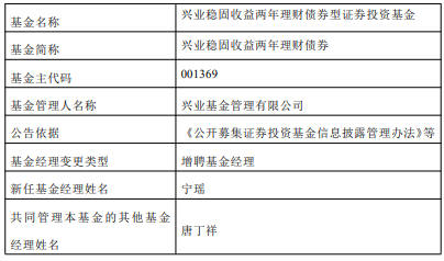 中国经济网北京2月5日讯 今日,兴业基金公告,兴业稳固收益两年理财债券增聘宁瑶。 宁瑶曾供职于华宝证券股份有限公司证券投资部担任债券交易员。2017年12月加入兴业基金管理有 限公司,先后担任交易部债券交易岗、固定收益投资部专户投资经理助理、固定收益投资部基金经理助 理。2024年12月17日起担任基金经理。 兴业稳固收益两年理财债券成立于2015年06月10日,截至2026年02月04日,其今年来收益率为 0.12%,成立来收益率为32.83%,累计净值为1.2911元。 | 基金名称 | 兴业稳固收益两年理财债券型证券投资基金 | | --- | --- | | 基金简称 | 兴业稳固收益两年理财债券 | | 基金主代码 | 001369 | | 基金管理人名称 | 兴业基金管理有限公司 | | 公告依据 | 《公开募集证券投资基金信息披露管理办法》等 | | 基金经理变更类型 | 增聘基金经理 | | 新任基金经理姓名 | 宁瑶 | | 共同管理本基金的其他基金 | 唐丁祥 | | 经理姓名 | | (责任编辑:康博) ...