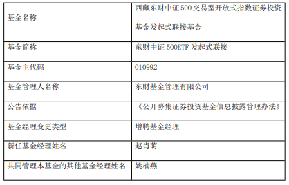 Core Viewpoint - The announcement from Dongcai Fund indicates a change in the management of the A500ETF Dongcai, with Yao Nanyan leaving the position of fund manager and Wu Yi taking over the management responsibilities [1][2]. Group 1: Fund Management Changes - Yao Nanyan has been dismissed as the fund manager of A500ETF Dongcai [2]. - Wu Yi, currently the assistant general manager and head of quantitative investment at Tibet Dongcai Fund Management Co., Ltd., will manage the fund [1][2]. Group 2: Fund Performance - As of February 4, 2026, the A500ETF Dongcai has achieved a year-to-date return of 4.44% [1]. - Since its inception on December 30, 2024, the fund has recorded a total return of 36.81% [1]. - The cumulative net asset value of the fund is reported to be 1.3681 yuan [1].