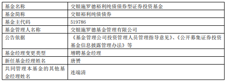 中国经济网北京2月4日讯 今日,交银施罗德基金公告,交银裕利纯债债券增聘唐赟。 唐赟历任渣打银行环球企业部助理客户经理、平安资产管理公司信用分析员。2012年加入交银施罗德基 金管理有限公司,历任固定收益部研究员/基金经理助理/基金经理。 交银裕利纯债债券A/C成立于2016年11月23日,截至2026年02月03日,其今年来收益率为0.18%、 0.18%,成立来收益率为30.23%、26.20%,累计净值为1.2776元、1.2620元。 | 基金名称 | 交银施罗德裕利纯债费券型证券投资基金 | | --- | --- | | 基金简称 | 交银裕利纯债债券 | | 基金主代码 | 519786 | | 基金管理人名称 | 交银施罗德基金管理有限公司 | | 公告依据 | 《基金管理公司投资管理人员管理指导意见》、《公开募集证券投资 | | | 基金信息披露管理办法》等 | | 基金经理变更类型 | 增聘基金经理 | | 新任基金经理姓名 | 唐梦 | | 共同管理本基金的其他基 | 连嘴清 | | 金经理姓名 | | ...