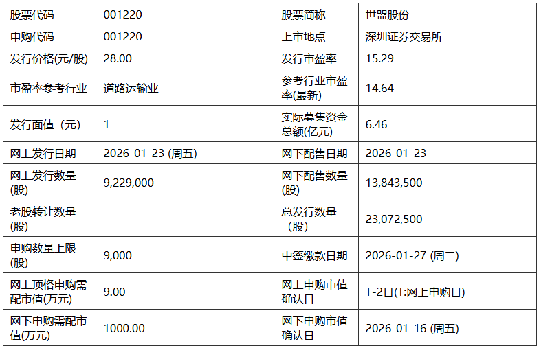 截至招股意向书签署之日,张经纬直接持有公司49.84%的股份,并通过北京世盟投资有限责任公 司间接持有公司7.22%的股份,合计持有公司57.06%的股份,同时担任公司董事长、总经理和法定代表 人,为公司的控股股东和实际控制人。 世盟股份2026年1月15日披露的招股意向书显示,公司拟募集资金70,842.31万元,分别用于世盟供 应链运营拓展项目、世盟运营中心建设项目、世盟公司信息化升级改造项目、补充营运资金。 公司简介: 据招股意向书,世盟股份专注于为跨国制造企业提供定制化、一体化、嵌入式的供应链物流解决方 案。公司致力于满足客户先进生产制造体系中的高效、及时、灵活性供应链管理需求,提供包括运输服 务、仓储及管理服务、关务服务在内的全方位、一体化综合物流服务,助力客户缩短生产周期、降低库 存成本、提高生产经营效率。 世盟供应链管理股份有限公司 保荐机构(主承销商):中国国际金融股份有限公司 发行情况: | 股票代码 | 001220 | 股票简称 | 世闊股份 | | --- | --- | --- | --- | | 申购代码 | 001220 | 上市地点 | 深圳证券交易所 | | 发行价格(元/股 ...