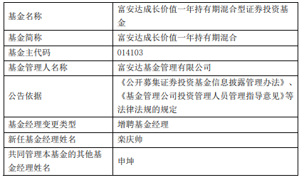 中国经济网北京2月3日讯 今日,富安达基金公告,富安达成长价值一年持有期混合增聘栾庆帅。 富安达成长价值一年持有期混合A/C成立于2021年12月28日,截至2026年02月02日,其今年来收益 率为-4.22%、-4.26%,成立来收益率为-14.23%、-15.97%,累计净值为0.8577元、0.8403元。 | 基金名称 | 富安达成长价值一年持有期混合型证券投资基 | | --- | --- | | 金 | | | 基金简称 | 富安达成长价值一年持有期混合 | | 基金主代码 | 014103 | | 基金管理人名称 | 富安达基金管理有限公司 | | 公告依据 | 《公开募集证券投资基金信息披露管理办法》、 | | | 《基金管理公司投资管理人员管理指导意见》等 | | | 法律法规的规定 | | 基金经理变更类型 | 增聘基金经理 | | 新任基金经理姓名 | 栾庆帅 | | 共同管理本基金的其他基 | 申坤 | | 金经理姓名 | | (责任编辑:康博) 栾庆帅历任中山证券有限责任公司化工行业研究员;国民信托有限公司研究员;富安达基金管理有 限公司投资研究部高级行业研究员。 ...