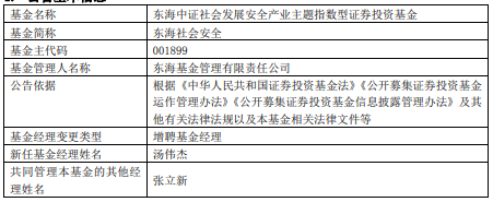 汤伟杰曾于中国大地财产保险股份有限公司信息科技部任需求分析师,于中泰证券股份有限公司任 金融工程分析师。2025年10月加入东海基金,任权益投资部基金经理助理,主要负责权益投资研究工 作。 (责任编辑:康博) 中国经济网北京2月3日讯 近日,东海基金公告,东海社会安全增聘汤伟杰。 | 基金名称 | 东海中证社会发展安全产业主题指数型证券投资基金 | | --- | --- | | 基金简称 | 东海社会安全 | | 基金主代码 | 001899 | | 基金管理人名称 | 东海基金管理有限责任公司 | | 公告依据 | 根据《中华人民共和国证券投资基金法》《公开募集证券投资基金 运作管理办法》《公开募集证券投资基金信息披露管理办法》及其 | | | 他有关法律法规以及本基金相关法律文件等 | | 基金经理变更类型 | 增聘基金经理 | | 新任基金经理姓名 | 汤伟杰 | | 共同管理本基金的其他经 | 张立新 | | 理姓名 | | 东海社会安全成立于2015年11月23日,截至2026年02月02日,其今年来收益率为3.60%,成立来收 益率为-42.50%,累计净值为0.5750元。 ...