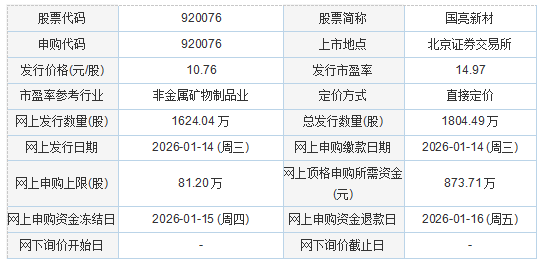 Group 1 - The company, Hebei Guoliang New Materials Co., Ltd., specializes in high-temperature industrial refractory materials and provides comprehensive solutions for refractory materials [2] - The company plans to raise a total of 19,416.26 million yuan through its public offering, with a net amount expected to be 17,502.20 million yuan after deducting issuance costs [3] - The issuance price is set at 10.76 yuan per share, with an earnings per share (EPS) ratio of 14.97, which is aligned with the non-metallic mineral products industry [1] Group 2 - The major shareholders, Dong Guoliang and Zhao Sulan, hold a combined 71.99% of the company's shares, with Dong Guoliang directly owning 63.15% [2] - The company aims to use the raised funds for technological upgrades, production line construction, and working capital supplementation [3] - The public offering is scheduled for January 12, 2026, with a maximum subscription limit of 81.20 million shares for online investors [1]