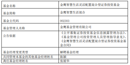 | 基金名称 | 金鹰智慧生活灵活配置混合型证券投资基金 | | --- | --- | | 基金简称 | 金鹰智慧生活混合 | | 基金主代码 | 002303 | | 基金管理人名称 | 金鹰基金管理有限公司 | | 公告依据 | 《公开募集证券投资基金信息披露管理办法》、 《基金管理公司投资管理人员管理指导意见》、 | | | 《金鹰智慧生活灵活配置混合型证券投资基金基 | | | 金合同》 | | 基金经理变更类型 | 解聘基金经理 | | 共同管理本基金的其他基金经理姓名 | 陈颖 | | 离任基金经理姓名 | 张展华 | | 基金名称 | 金鹰中小盘精选证券投资基金 | | --- | --- | | 基金简称 | 金鹰中小盘精选混合 | | 基金主代码 | 162102 | | 基金管理人名称 | 金鹰基金管理有限公司 | | 公告依据 | 《公开募集证券投资基金信息披露管理办法》、 | | | 《基金管理公司投资管理人员管理指导意见》、 | | | 《金鹰中小盘精选证券投资基金基金合同》 | | 基金经理变更类型 | 解聘基金经理 | | 共同管理本基金的其他基金经理姓名 | 陈颖 | | 离 ...