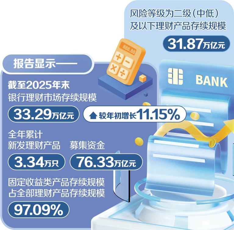 面对大量资金涌入,理财公司在资产端面临更多机遇和挑战。一方面,新质生产力蓬勃发展、"南向通"扩容 等为理财行业提供了优质投资标的;另一方面,随着广谱利率持续下行,固收类资产收益随之回落,传统高 收益资产供给面临收缩。中银理财表示,在此背景下,要平衡好客户期望稳健收益和优质资产稀缺的矛盾, 一是要推动投资范式从"资产引领"向"策略引领"转变,减少对单一品类资产、单一赛道红利的依赖,搭建多 元策略池;二是要做好客户精细化分层,以客户风险偏好和收益目标为导向,匹配相应的策略组合。 年关将至,银行理财市场热度不减。随着存款利率下行,不少低风险偏好资金向银行理财迁徙。 1月23日,银行业理财登记托管中心发布的《中国银行业理财市场年度报告(2025年)》显示,截至2025年 末,银行理财市场存续规模33.29万亿元,较年初增长11.15%;全年累计新发理财产品3.34万只,募集资金 76.33万亿元。其中,固定收益类产品存续规模为32.32万亿元,占全部理财产品存续规模的97.09%;风险等 级为二级(中低)及以下的理财产品存续规模为31.87万亿元,占全部理财产品存续规模的95.73%。 上海金融与发展实验室首席专家、 ...