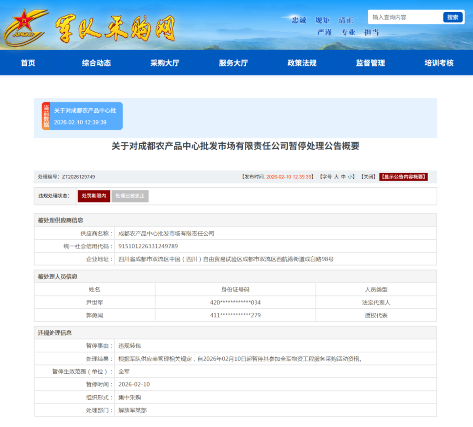 齐鲁晚报·齐鲁壹点 记者 张洁清 2月10日,军队采购网发布公告,成都农产品中心批发市场有限责任公司在军队采购活动中,涉嫌存在违规失信行为。根据军队供应商管 理相关规定,暂停其参加全军物资工程服务采购活动资格。 | | | 输入查询内容 搜索 HK PK 规矩 滑正 | | --- | --- | --- | | | | 严谨 专业 担当 | | 首页 | 综合动态 | 采购大厅 服务大厅 政策法规 监督管理 培训考核 | | 关于对成都农产品中心批 2026-02-10 12:39:39 | | | | | | 关于对成都农产品中心批发市场有限责任公司暂停处理公告概要 | | 处理编号:ZT2026129749 | | 【发布时间: 2026-02-10 12:39:39】 【字号 大 中 小】【关闭】【显示公告内容概要】 | | 违规处理状态: | 处罚期限内 | 处理已被更正 | | 被处理供应商信息 | | | | 供应商名称: | | 成都农产品中心批发市场有限责任公司 | | 统一社会信用代码: | | 915101226331249789 | | 企业地址: | | 四川省成都市双流区中国(四川 ...