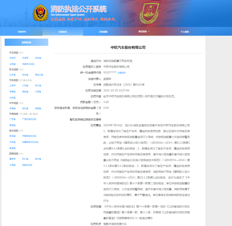 3、其新建车间为丁类生产车间,擅自改变使用性质,作为丙类生产车间和丙类仓库使用,消防用电不符合《建 筑防火设计规范》(GB50016—2014)第10.1.2条第1点的规定,该行为违反了《中华人民共和国消防法》第十六 条第一款第二项的规定,单位未按规定配置的自动灭火系统、火灾自动报警系统,室外和室内消火栓流量、消防 用电属于A类设施应设未设的情形,属于严重违法。单位具有主动消除消防安全违法行为。 对此,常熟市消防救援大队依据《中华人民共和国消防法》第六十条第一款第一项和《江苏省消防行政处罚裁量 权基准》第十条第一款、第十二条,并参照《江苏省消防行政处罚裁量权基准》对照表编号002-1一般违法情形, 给予中欧汽车处罚款人民币叁万元整的行政处罚。处罚决定书文号:苏熟消行罚决字〔2025〕第0163号。 国家企业信用信息公示系统显示,中欧汽车股份有限公司成立于2006年,注册资本11680万元,法定代表人池凤 珠。 中欧汽车的被处罚事由栏显示,2025年7月24日,常熟市消防救援大队消防监督员在检查中发现: 1、中欧汽车新建车间为丁类生产车间,擅自改变使用性质,部分区域作为丙类仓库使用,丙类仓库未按规定配 置自动灭 ...
