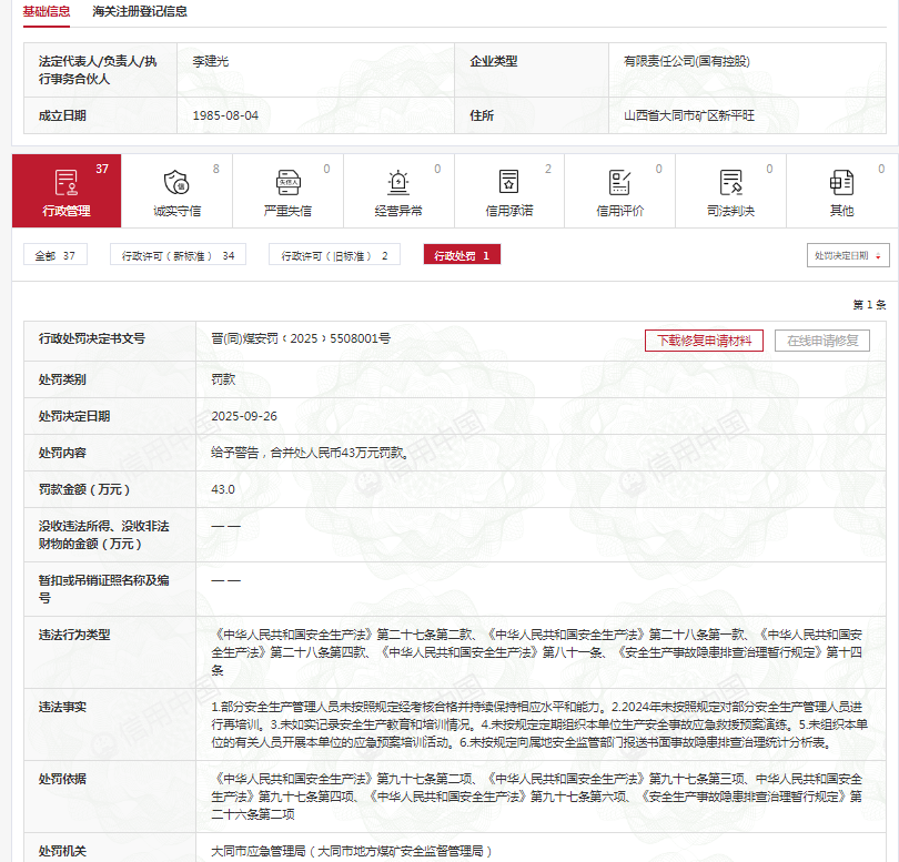 齐鲁晚报·齐鲁壹点记者于信用中国行政处罚栏获悉,9月26日,晋能控股煤业集团有限公司(下称"晋能控股煤业集团")收罚单,处罚机关是大同市应急管 理局(大同市地方煤矿安全监督管理局)。行政处罚决定书文号:晋(同)煤安罚﹝2025﹞5508001号。 | 重新信息 海关注册登记信息 | | | | | | --- | --- | --- | --- | --- | | 法定代表人/负责人/执 | 李建元 | 企业学理 有限责任公司(国有控股) | | | | 行事务合伙人 | | | | | | 成立日期 | 1985-08-04 | 山西首大同市矿区新平旺 | 住所 | | | 37 | 8 | 2 0 ਨ lıb | 0 0 | 0 | | 行政管理 | 成果守信 严氧失信 | 信用承诺 信用评价 | 经营异常 | 司法判决 真他 | | 全部 37 | 行政法可(新标准) 34 | | 行政许可(旧标准) 2 行政处罚 1 | 处罚决定日期 ÷ | | | | | | 第1条 | | 行政处罚决定书文号 | 晋(同)煤安罚(2025)5508001号 | | | 下载修复申请材料 在线申请修复 | | 处罚 ...