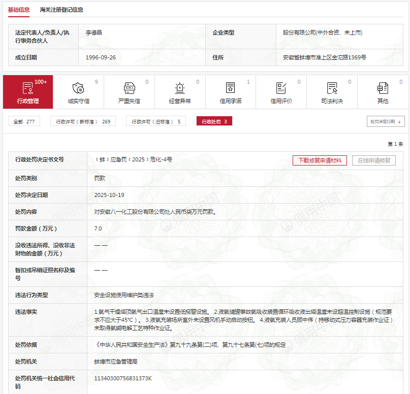 Core Points - Anhui Bayi Chemical Co., Ltd. was fined 70,000 RMB for safety facility maintenance violations by the Bengbu Emergency Management Bureau on October 19, 2025 [1][3] Company Information - Anhui Bayi Chemical was established on September 26, 1996, with a registered capital of 33,750,000 RMB [6] - The company is a joint venture, with 60% ownership by Temasek Holdings through its subsidiary, Xiangfeng China Chemical Investment Co., Ltd. [5] - The legal representative of the company is Li Dechang [6] Violations and Penalties - The violations included: 1. Failure to set low alarm facilities for the ammonia outlet temperature at the top of the gas drying tower 2. Lack of over-temperature control facilities for the circulating absorption liquid temperature at the liquid chlorine storage tank (should not exceed 45°C) 3. Absence of a manual start button for the fan in the outdoor liquid chlorine filling area 4. An employee engaged in filling operations did not possess the required special operation certificate for the chlor-alkali electrolysis process [2][3] Safety Management - The company claims to have established a comprehensive safety production responsibility system and formed a safety production (fire safety) committee [5] - It has a dedicated safety management organization with 13 full-time safety personnel and 15 registered safety engineers [5]