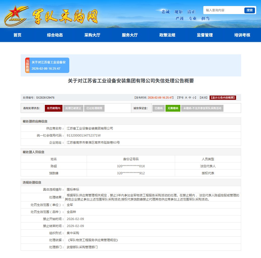 2月9日,军队采购网发布公告,江苏省工业设备安装集团有限公司在军队采购活动中,存在围标串标等违规行为。 武警部队采购管理部门根据军队供应 商管理相关规定,3年禁止全军物资工程服务采购活动的处罚。 | 处理编号: SX2026129476 | | | | 【发布时间: 2026-02-09 16:25:47】 【字号 大 中 小】 【关闭】 【显示公告内容概要】 | | | | | --- | --- | --- | --- | --- | --- | --- | --- | | 违规处理状态: 处罚期限内 | 处理已被更正 | 已过处理期限 | | 诚信保证金: 已缴纳 | | 无需缴纳 | 未缴纳-不允许参加军队采购活动 | | 被处理供应商信息 | | | | | | | | | 供应商名称: | 江苏省工业设备安装集团有限公司 | | | | | | | | 统一社会信用代码 : | 91320000134752371W | | | | | | | | 企业地址: | 江苏省南京市秦淮区南京市延龄巷63号 | | | | | | | | 被处理人员信息 | | | | | | | | | 姓名 | | ...