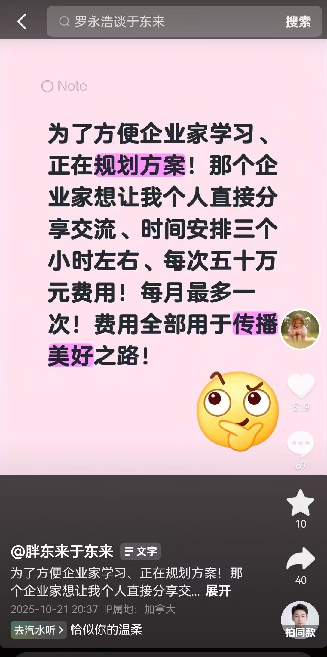 于东来称:"还会有免费的,我在网上与大家直播分享交流。" 10月21日,于东来在社媒连续发文。于东来称:"为了方便企业家学习、正在规划方案!哪个企业家想让我个人直接分享交流、时间安排三个小时左右、每 次五十万元费用!每月最多一次!费用全部用于传播美好之路!" 于东来表示"正在规划明年由联商学院组织收十个以内的企业家到胖东来学习、每年二到三次、两天的交流活动!每人费用100万元!收入费用全部用于传 播美好之路!" @胖东来于东来 三文字 为了方便企业家学习、正在规划方案!那 个企业家想让我个人直接分享交... 展开 2025-10-21 20:37 IP属地:加拿大 去汽水听 > 恰似你的温桑 ) Note 为了继续帮助到想学习胖东 来的企业家! 正在规划明年 曲联商学院组织收十个以内 的企业家到胖东来学习、每 年二到三次、两天的交流活 每人费用100万元! 收 E 入费用全部用于传播美好之 @胖东来于东来 |三文字 为了继续帮助到想学习胖东来的企业家! 正在规划明年由联商学院组织... 展开 2025-10-21 20:26 IP属地:加拿大 去汽水听 > 秋恋(萨克斯) - AYLIS Q 于东来披露胖东来 ...