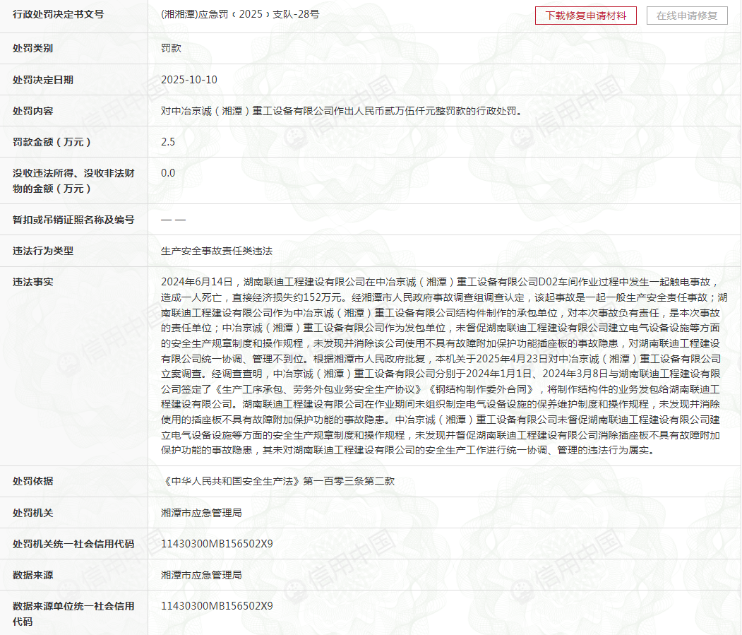 日前,信用中国公示了中冶京诚(湘潭)重工设备有限公司的行政处罚决定。行政处罚决定书文号(湘湘潭)应急罚﹝2025﹞支队-28号显示,中冶京诚(湘 潭)重工设备有限公司的违法行为类型为生产安全事故责任类违法。 2024年6月14日,湖南联迪工程建设有限公司在中冶京诚(湘潭)重工设备有限公司D02车间作业过程中发生一起触电事故,造成一人死亡,直接经 济损失约152万元。经湘潭市人民政府事故调查组调查认定,该起事故是一起一般生产安全责任事故;湖南联迪工程建设有限公司作为中冶京诚(湘 潭)重工设备有限公司结构件制作的承包单位,对本次事故负有责任,是本次事故的责任单位;中冶京诚(湘潭)重工设备有限公司作为发包单位, 未督促湖南联迪工程建设有限公司建立电气设备设施等方面的安全生产规章制度和操作规程,未发现并消除该公司使用不具有故障附加保护功能插座 板的事故隐患,对湖南联迪工程建设有限公司统一协调、管理不到位。 | 行政处罚决定书文号 | (湘湘潭)应急罚(2025)支队-28号 | 下载修复申请材料 | 在线申请修复 | | --- | --- | --- | --- | | 处罚类别 | 罚款 | | | | 处罚决定 ...