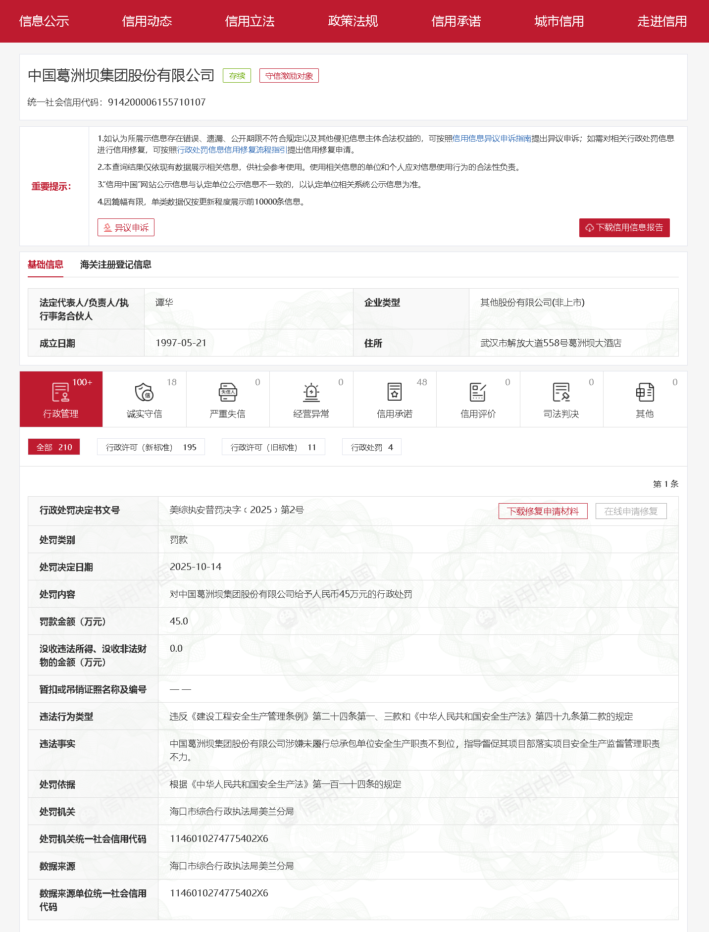 近日,齐鲁晚报·齐鲁壹点记者从信用中国获悉,中国葛洲坝集团股份有限公司涉嫌未履行总承包单位安全生产职责不到位,指导督促其项目部落实项目安 全生产监督管理职责不力。被海口市综合行政执法局美兰分局罚款45万元。 | 处罚依据 | · 1 . 1 - 1 . 根据《中华人民共和国安全生产法》第一百一十四条的规定 | | --- | --- | | 处罚机关 | 海口市综合行政执法局美兰分局 | | 处罚机关统一社会信用代码 | 1146010274775402X6 | | 数据来源 | 海口市综合行政执法局美兰分局 | | 数据来源单位统一社会信用 代码 | 1146010274775402X6 | | 企业概况 | | --- | | 公司简介 | | 领导团队 | | 组织机构 | | 历史沿革 | | 基地掠影 | | 领导关怀 | | 大事记 | | 资质权益 | | 人才队伍 | | 科技实力 | | 企业荣誉 | | 品牌工程 | | 党群工作 | | 企业文化 | | 社会责任 | 该公司官网介绍,葛洲坝集团是中国能建的核心骨干子企业,成立于1970年,其前身三三零指挥部由中央批准成立,后相继转隶原水 ...