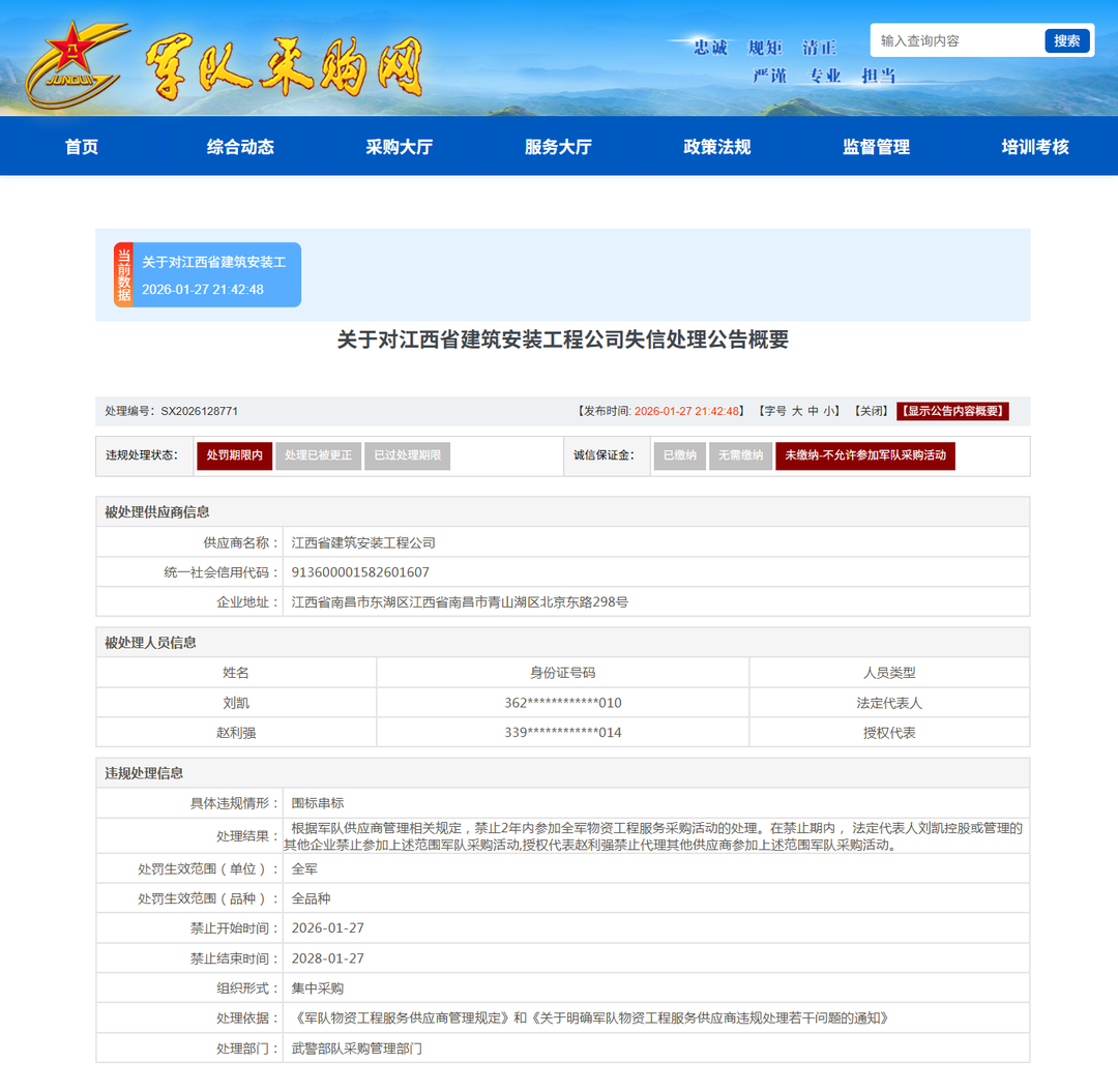 《关于对江西省建筑安装工程公司失信处理公告》(处理编号:SX2026128771)显示,经调查核实,江西省建筑安装工程公司在参加项目编号:2022- JWZJLS-W1001采购活动中,存在围标串标等违规行为。根据军队供应商管理相关规定,2年禁止全军物资工程服务采购活动的处罚。 以上处理自2026年01月27日起算。在禁止期内, 法定代表人刘凯控股或管理的其他企业禁止参加上述范围军队采购活动,授权代表赵利强禁止代理其他供 应商参加上述范围军队采购活动。 齐鲁晚报·齐鲁壹点 记者 张洁清 天眼查显示,江西省建筑安装工程公司成立于1979年,系集体所有制建筑企业,注册资本2600万元,登记机关为江西省市场监督管理局。持有住房和城乡 建设部颁发的建筑工程施工总承包一级资质。 近期,军队采购网发布公告,江西省建筑安装工程公司在军队采购活动中存在围标串标等违规行为。根据军队供应商管理相关规定,2年禁止全军物资工 程服务采购活动的处罚。 ...