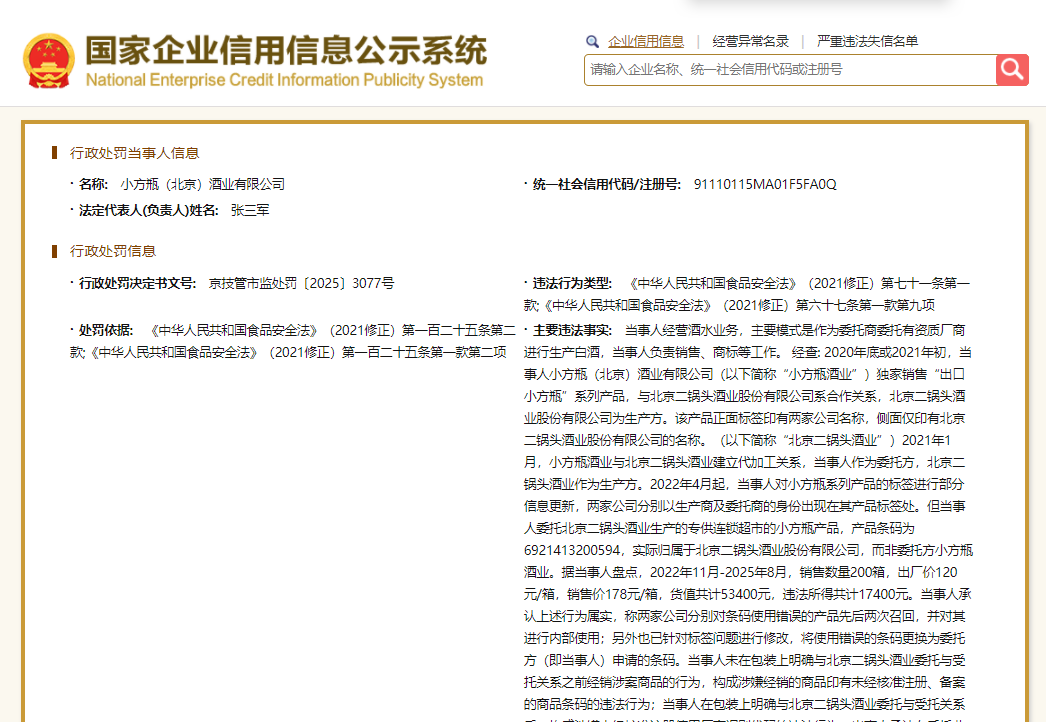 近日,北京经济技术开发区管理委员会公布一则行政处罚决定,小方瓶(北京)酒业有限公司因旗下"出口小方瓶"系列产品存在多项标签标识及商 品条码违法行为,被处以没收违法所得20万元、罚款1万元的行政处罚,行政处罚决定日期:2025年10月11日。 根据行政处罚决定书(文号:京技管市监处罚〔2025〕3077号),小方瓶酒业的违法行为主要集中在三个方面,且持续时间长达数年。 首要问题是商品条码使用混乱。调查发现,在小方瓶酒业作为委托方、北京二锅头酒业股份有限公司作为生产方的合作模式下,其专供连锁超市的 一款产品,所使用的商品条码实际归属于生产方北京二锅头,而非委托方小方瓶酒业。这种行为构成了经销印有未经核准注册、备案的商品条码的 违法行为。尽管当事人声称已对问题产品进行召回并更换条码,但违法行为已经成立。 其次是标签信息标注不全,未能清晰体现委托加工关系。执法机关查明,在2023年之前生产的部分规格产品上,标签未按规定同时标注委托单位和 受委托单位的名称和地址,违反了《食品安全国家标准预包装食品标签通则》的强制性规定。此外,尽管两家公司注册地址在同一院内,但标签上 仅标注一个地址的行为,仍被认定为标签瑕疵违法行为。 ...