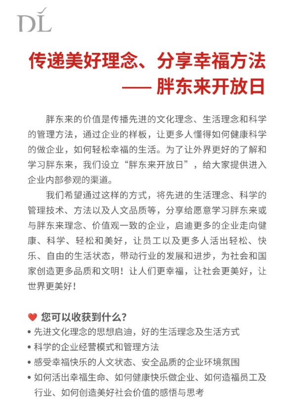 公告称,希望通过这样的方式,将先进的生活理念、科学的管理技术、方法以及人文品质等,分享给愿 意学习胖东来或与胖东来理念、价值观一致的企业。 10月20日,胖东来商贸集团官方发布公告称,将设立"胖东来开放日",给大家提供进入企业内部参观的 渠道。 | 开放日时间 参访范围 | | 参访人数 | 预约方式 | 收费标准 | | --- | --- | --- | --- | --- | | 每月10日、20日 | 产业园+天使城+时代广场 同一企业最多 | 每批次≤15人 预约5人 | 通过系统预约 并填报信息 | 20000元/人 | | 1.开放日如遇周二,往后顺延一日; | | | | | | 2.每年每个企业每人安排参访一次。 | | | | | 申请条件为:1、喜欢胖东来理念,希望学习和运用胖东来理念。2、对胖东来有一定认知和了解。3、 希望做品质企业、幸福企业,有造福员工和社会的愿望。 开放时间自2025年11月1日起,每月10日、20日。 根据公告,开放对象为企业级学习参访,费用标准为20000元/人。每批次为15人以内,同一企业最多5 人预约。 值得注意的是,近期,胖东来因12年老员工被开除频上热 ...