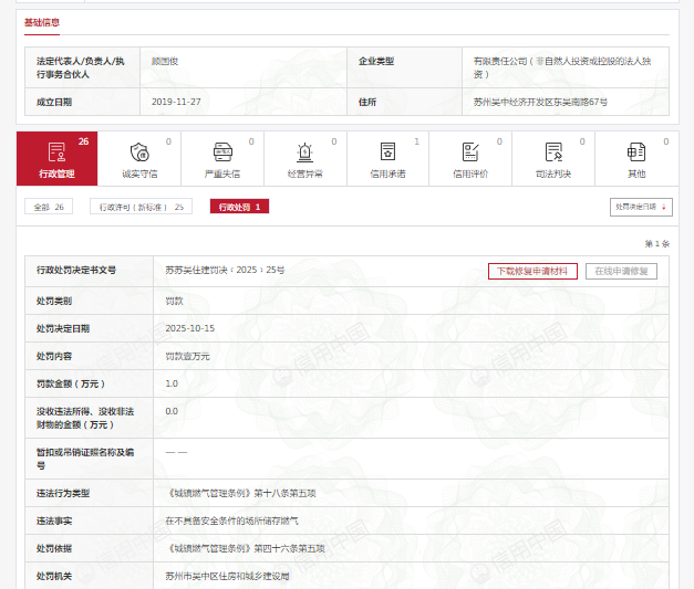 | 苏州燃气集团液化气有限责任公司 | | | 存续(在营、开业、在册) | | 发送报告 | | --- | --- | --- | --- | --- | --- | | 统一社会信用代码: 91320506MA20GNBX07 | | | | | | | 注册号: 法定代表人:顾国俊 | | | | | 信息分享 | | 登记机关: 苏州市吴中区行政审批局 | | | | | 信息打印 | | 成立日期: 2019年11月27日 | | | | | | | 基础信息 | 行政许可信息 行政处罚信息 | | | | 公告信息 | | ■营业执照信息 | | | | | | | · 统一社会信用代码: 91320506MA20GNBX07 | | | * 企业名称: 苏州燃气集团液化气有限责任公司 | | | | : 即量灰: | | | ·法定代表人:顾国俊 | | | | · 类型: 有限责任公司(非自然人投资或控股的法人治安) | | | · 成立日期: 2019年11月27日 | | | | ·注册资本: 20000.000000万人民币 | | | ·核准日期: 2024年01月30日 | | | ...