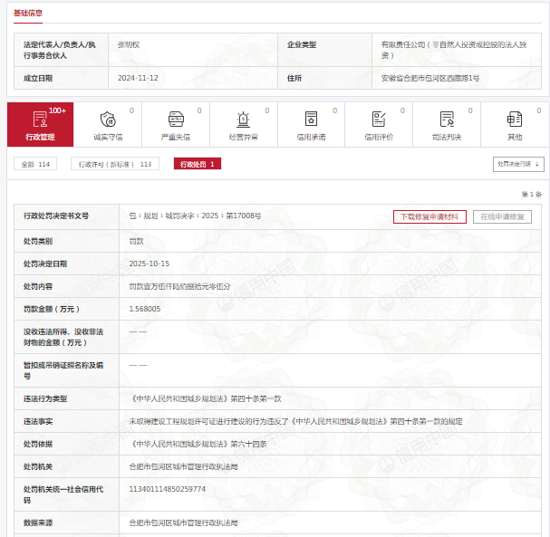 因未取得建设工程规划许可证进行建设,合肥轨交集团方兴置业被罚