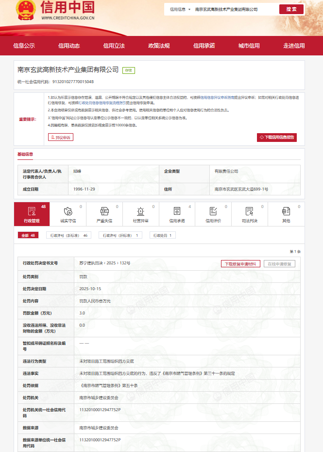 近日,齐鲁晚报·齐鲁壹点记者从信用中国获悉,南京玄武高新技术产业集团有限公司因未对项目施工范围组织四方交底的行 为,违反了《南京市燃气管理条例》第三十一条的规定,被南京市城乡建设委员会罚款3万元。 公开信息显示,南京玄武高新技术产业集团有限公司成立于1996年11月29日,法定代表人邱峰,股东为南京钟山资产经营管 理集团有限公司、国开基础设施基金有限公司和南京市玄武区人民政府国有资产监督管理办公室。 新闻热线电话:0531-85196566 ...
